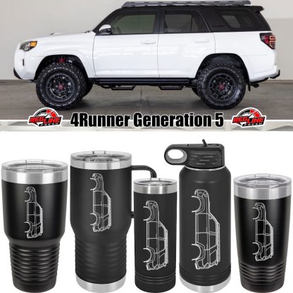 Elevate your daily hydration experience with our meticulously crafted 4Runner Generation 5 Silhouette drinkware collection. Each piece is laser engraved to order, with the car silhouette etched onto black tumblers, creating a stunning silver metal color contrast that beautifully represents your connection to your 4Runner Generation 5.